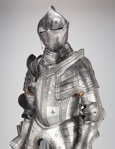 Stefan Rormoser, Armor for Field and Tilt, of Count Franz von Teuffenbach (1516-1578), detail, 1554, steel, brass, lampblack, restored leather, 2014.80, The John Woodman Higgins Armory Collection