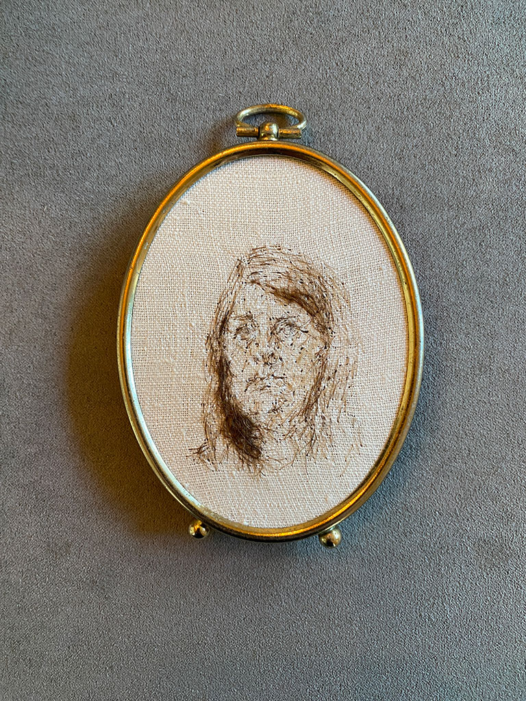 Schomp’s drawings are rooted in a tradition of using hair as a material—in particular, Victorian-era hair tokens and wreaths, which were symbols of affection and remembrance respectively. Using her own hair as thread, Schomp crafts portrait miniatures and scenes of the natural world. Set in antique-style frames that nod to their historic inspiration, these intimate drawings are grouped together to suggest emotions and stories. Schomp notes that, because hair can be seen as “both sensual and disgusting, [it] becomes a medium of tension, one that also reveals that a drawing can be both an illusion and an object. … a fibrous line, [it] must be both economical and at the same time layered in density to create the illusion of value at this smaller scale.”