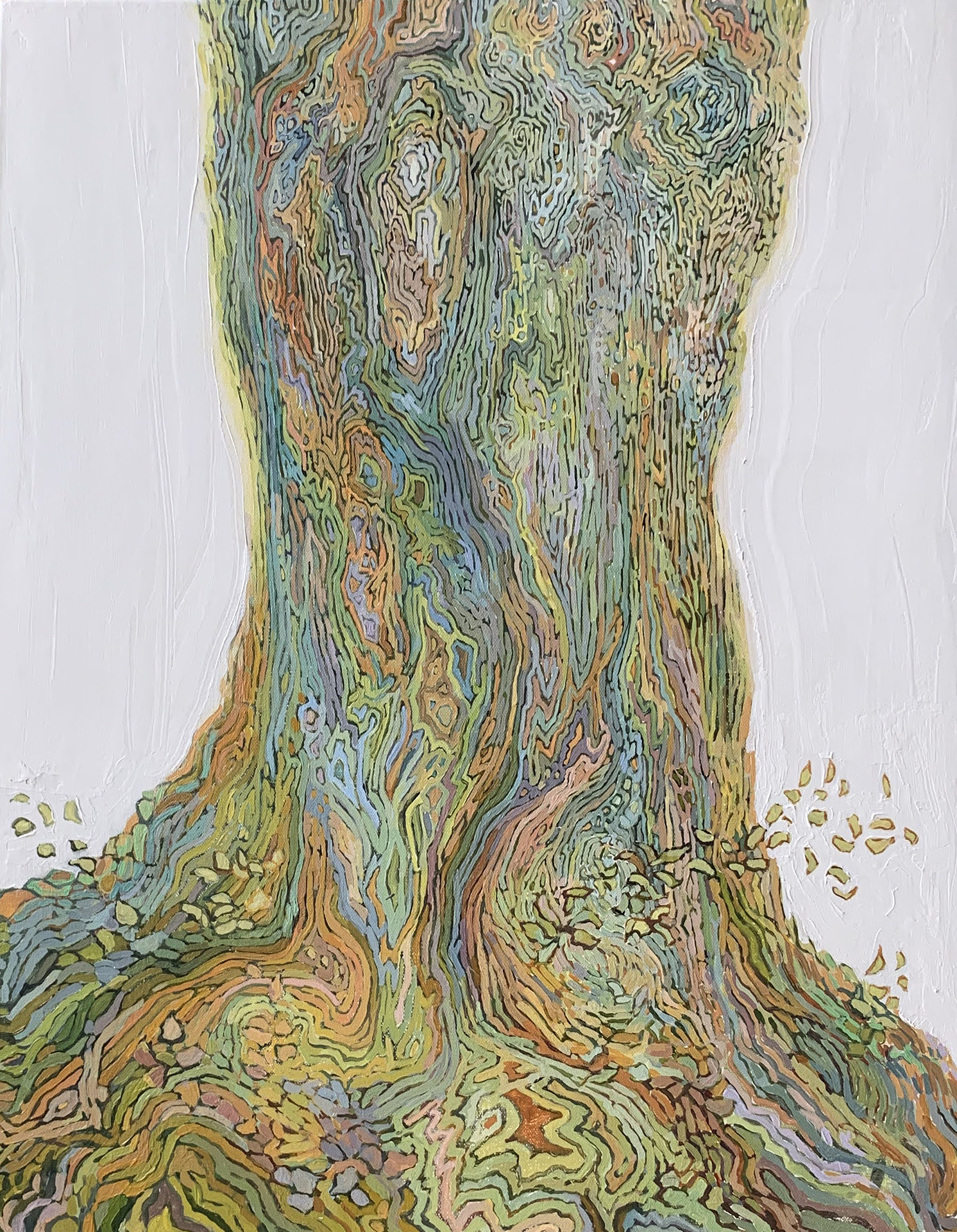 I experience a myriad of different neurological symptoms that I include in my painted worlds, including macroscopia, microscopia, and ocular aura. Daily, I see unsettling but mesmerizing visual artifacts that either partially obscure my view or are a filter, like looking at the world via a fairyland of hazy hot asphalt.