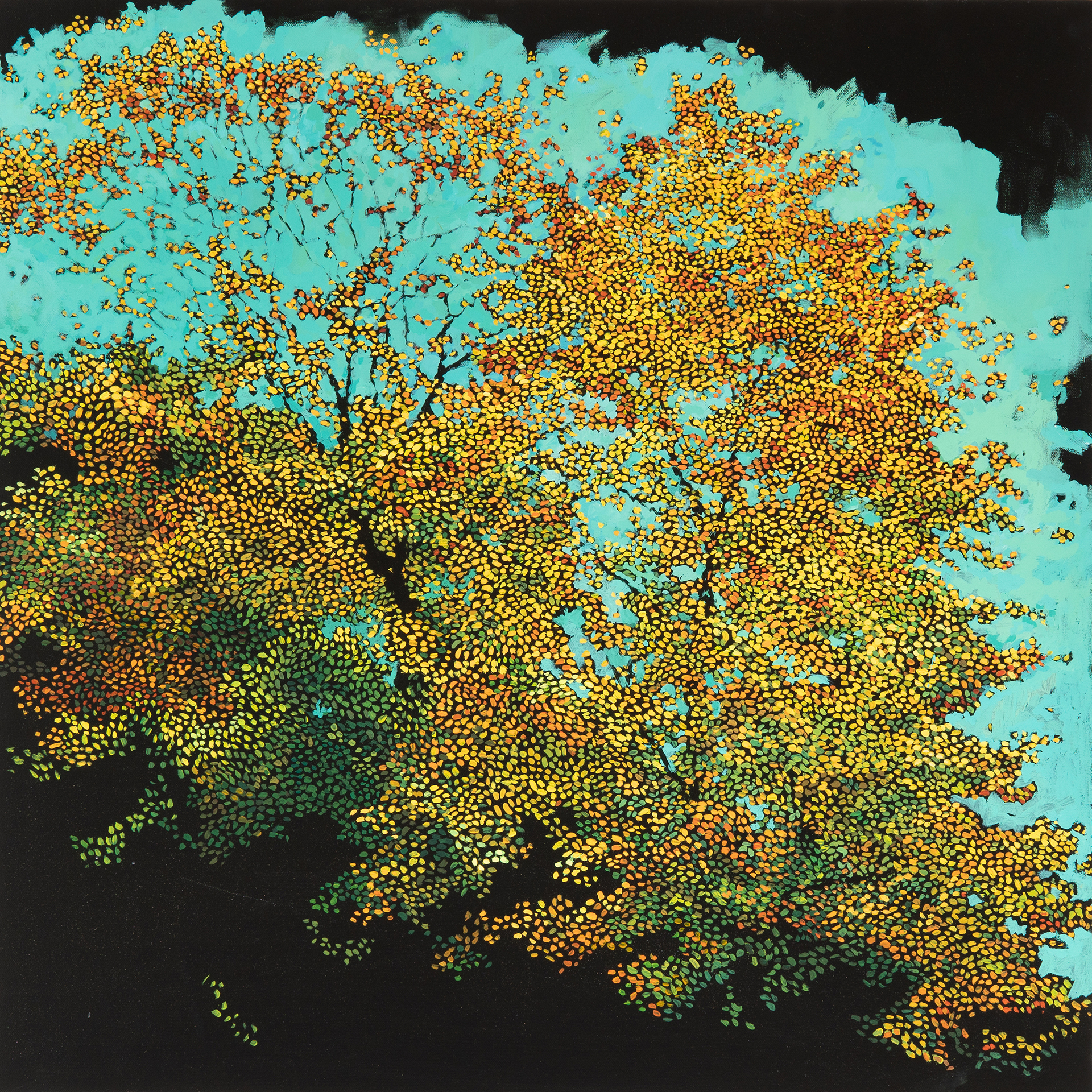 I developed my own adapted divisionism painting technique to represent what my neurological migraine optical distortion looks like and feels like. I use the physical properties of paint (opacity, gloss) to create the illusion of space and depth. The darkness in my black gessoed paintings is the canvas being revealed, subverting the viewers’ assumptions of primary and secondary objects.