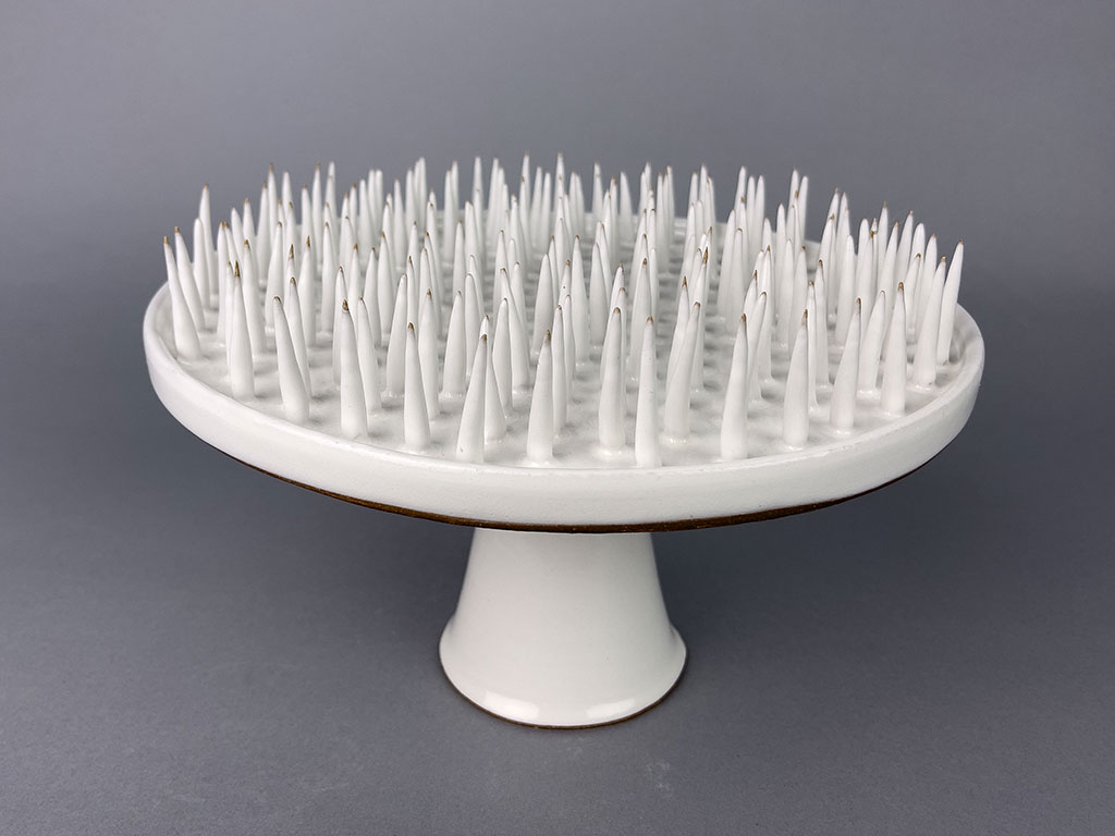 Bo Kim’s paintings of ornithological specimens merge the precision of a scientist with the sensitivity of an artist. By re-presenting natural science collections through a careful and observant lens, Kim highlights the artist’s role as both interpreter and advocate for social and environmental awareness. Her work challenges conventional systems of categorization and perception, encouraging viewers to reconsider the assumptions that shape our understanding of nature and one another. Lovstedt’s “hostile” and “inconvenient” objects confront us with their subversion of functionality in their everyday uses. A serving bowl with spikes or a multi-handled mug gives us pause and invites us to make space for the unspoken tension that may be present at the dinner table.